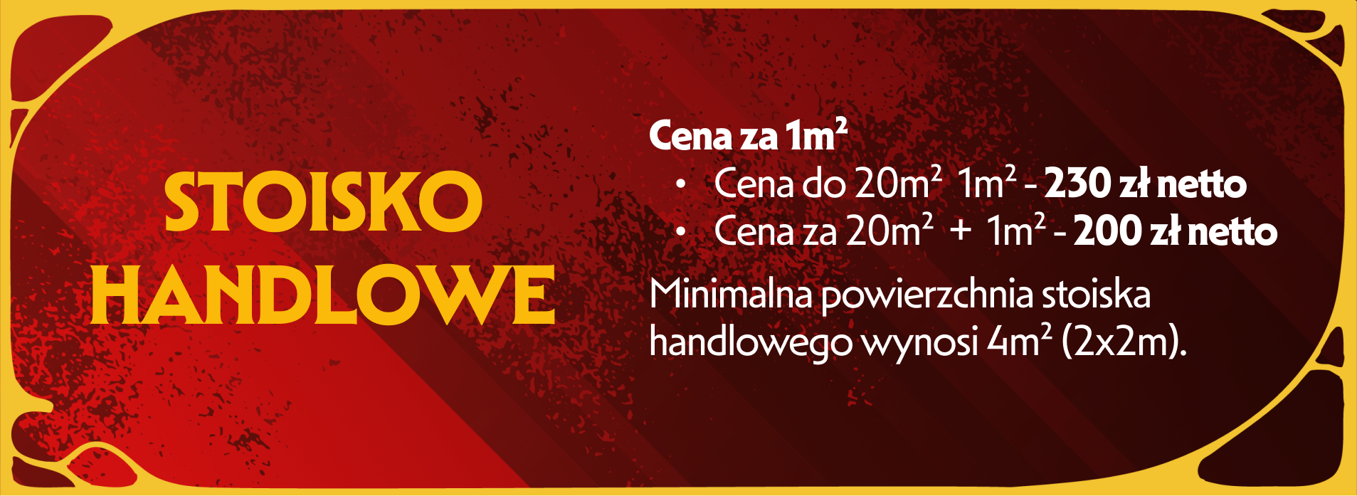 Stoiska handlowe są przeznaczone głównie dla sklepów i sprzedawców z ofertą dla geeków. Od gadżetów i gier po książki, ubrania i biżuterię. To także odpowiednia przestrzeń dla firm, które chcą stworzyć własne stoisko promocyjne.